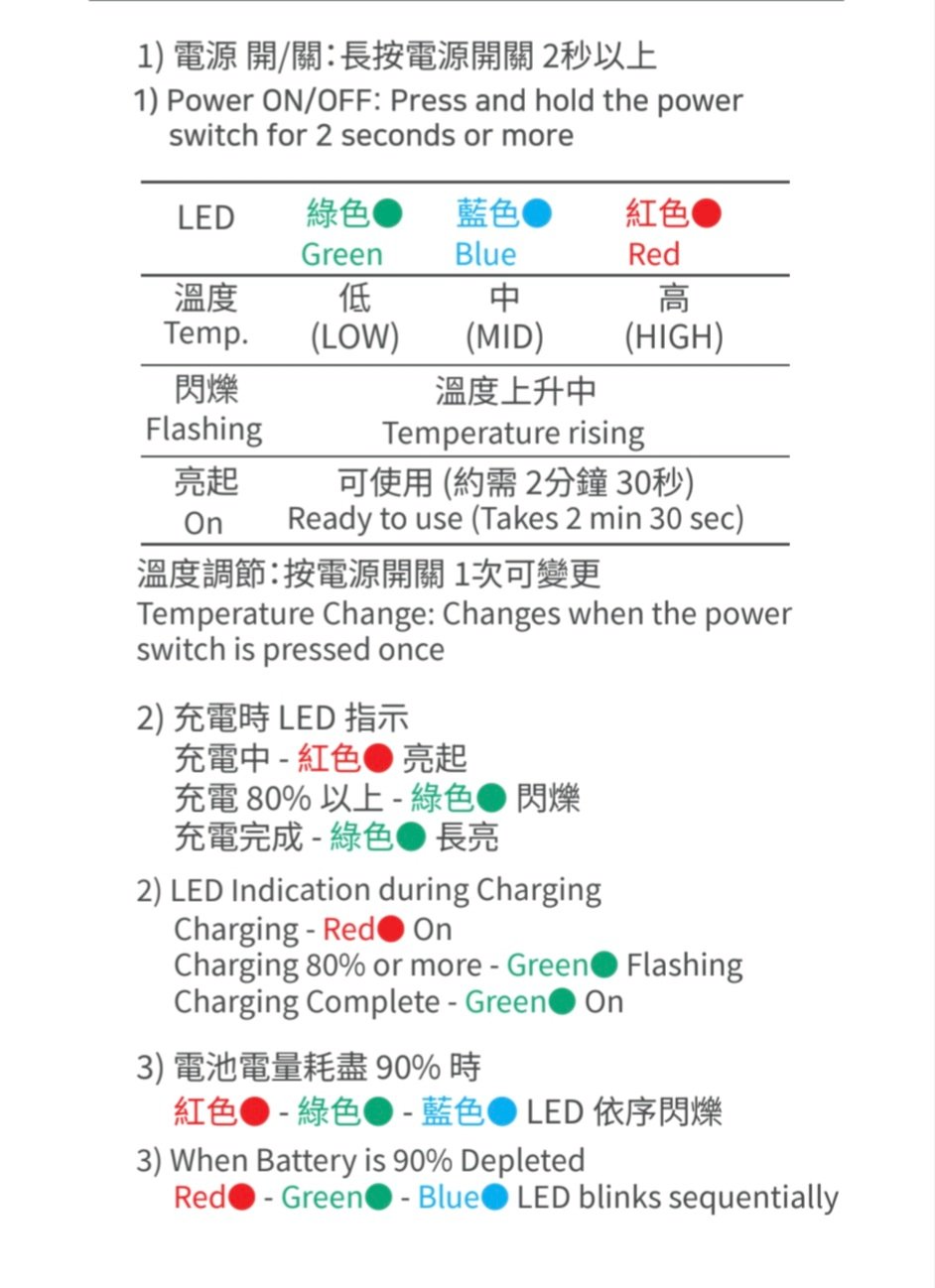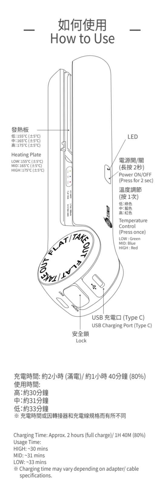 充電時間: 約2小時 (滿電)/ 約1小時 40分鐘 (80%) 使用時間: 高:約30分鐘 中:約31分鐘 低:約33分鐘 ※ 充電時間或因轉接器和充電線規格而有所不同 ※ 充電時產品無法運作。 ※ 使用中及充電中,手柄部位略微發熱是電池使用時的正常現象,請安心使用。 ※ 內置3.7V 3,000 mAh鋰電池,產品不包含充電器及電線,請使用5V 2A或以上的充電器及Type C 充電線。 ※ 解鎖時,請先按壓兩側發熱板。此外,如在鎖上時強行打開或扭轉發熱板,產品可能會損壞。 ※ 在鎖上時如過度用力打開產品,充電連接器 可能會損壞,導致無法充電。 原廠保養,掃描盒身QR Code登記保養 *所有電器均不包運費